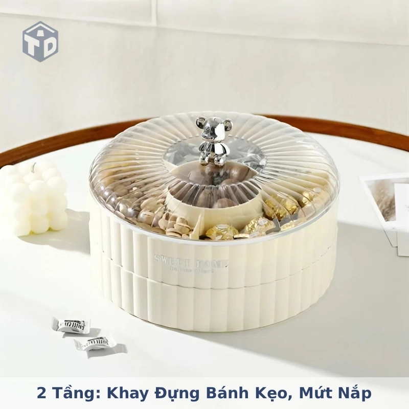 Khay Đựng Bánh Kẹo, Mứt 2 Tầng với thiết kế Nắp Hình Gấu là sự kết hợp hoàn hảo giữa nét đẹp trang trí và tính năng lưu trữ vượt trội, giúp bạn trưng bày đa dạng các loại mứt, kẹo ngày Tết một cách gọn gàng và ấn tượng.