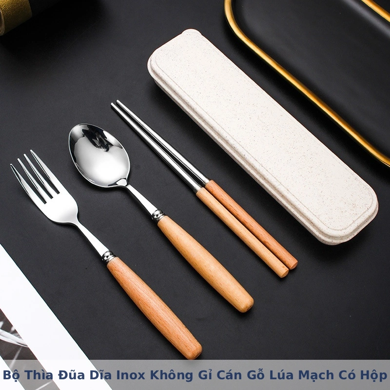 Bộ Thìa Đũa Dĩa Inox Không Gỉ Cán Gỗ Lúa Mạch – Gọn nhẹ, tinh tế, mang theo mọi nơi