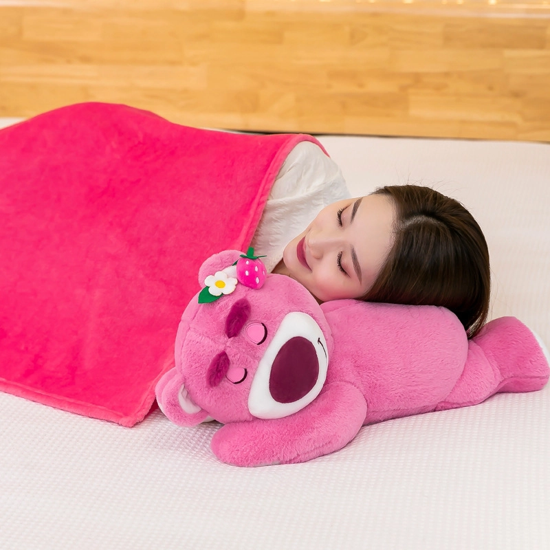 Gối có kiểu dáng ngộ nghĩnh với hình gấu dâu xinh xắn, vừa đẹp mắt vừa dễ thương, có thể dùng để gối đầu hoặc dựa lưng êm ái. Chăn được thiết kế khéo léo, có thể xếp gọn gàng bên trong gối, lấy ra sử dụng dễ dàng.