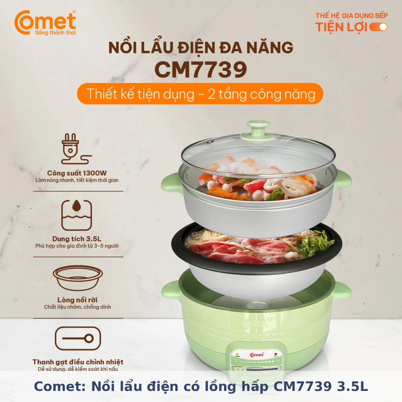 Nồi lẩu điện Comet CM7739 – Dung tích 3.5L, kèm xửng hấp tiện lợi là thiết bị gia dụng đa năng giúp bạn chế biến món ăn nhanh chóng, giữ trọn hương vị và dinh dưỡng. Với thiết kế hiện đại và công suất mạnh mẽ, sản phẩm giúp tiết kiệm thời gian nấu nướng, mang đến những bữa ăn ấm cúng và ngon miệng cho cả gia đình.
