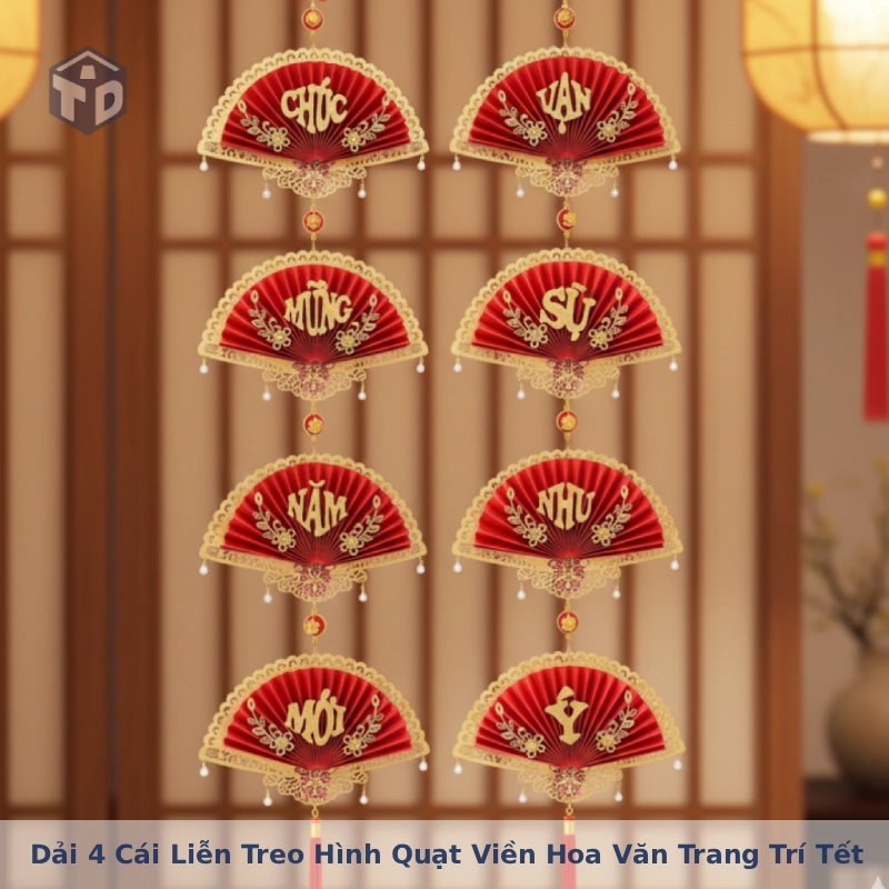 - Dải 4 liễn treo hình quạt được in 4 chữ chúc Tết ý nghĩa: Chúc Mừng Năm Mới và Vạn Sự Như Ý mang thông điệp may mắn, bình an và tài lộc cho năm mới.