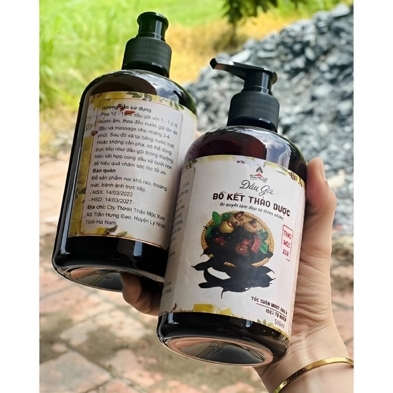 - 70% Bồ kết, 30% các loại lá thảo mộc quê (cỏ ngủ sắc; mần trầu; hương nhu; sả chanh; vỏ bưởi; gừng; quế).