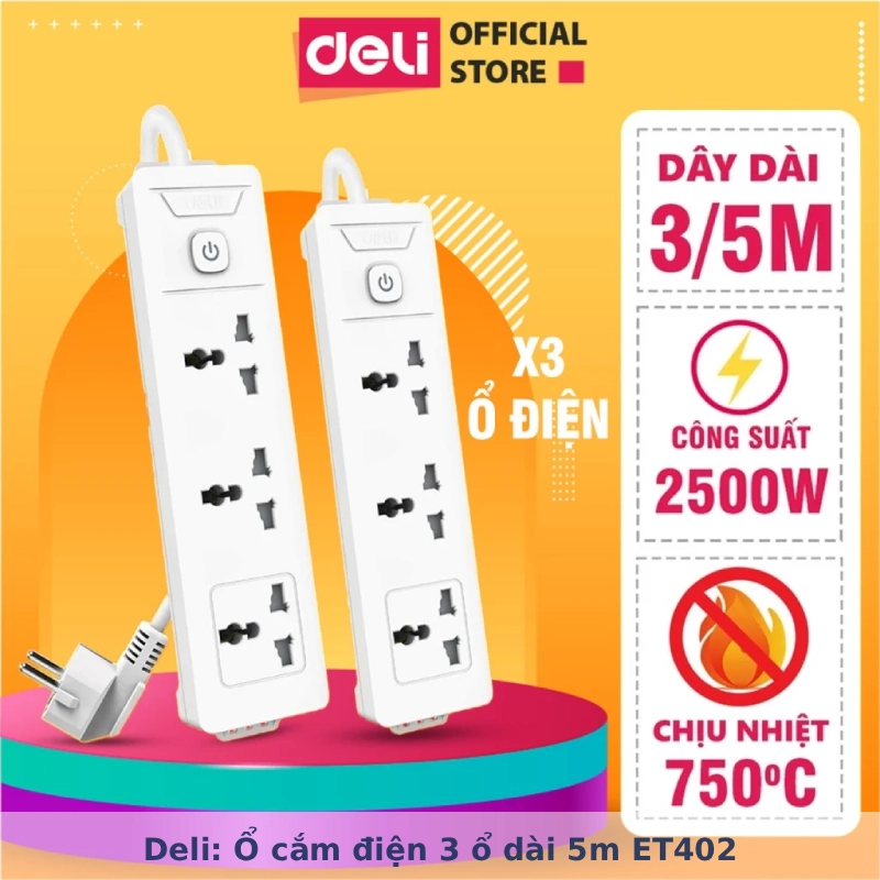 Ổ cắm điện Deli ET402 là một sản phẩm thiết yếu, cung cấp giải pháp nguồn điện an toàn và linh hoạt cho nhu cầu sử dụng cơ bản. Với 3 ổ cắm và dây dài 5 mét, sản phẩm này rất tiện lợi để dùng trong gia đình hoặc các khu vực cần mở rộng nguồn điện một cách gọn gàng.