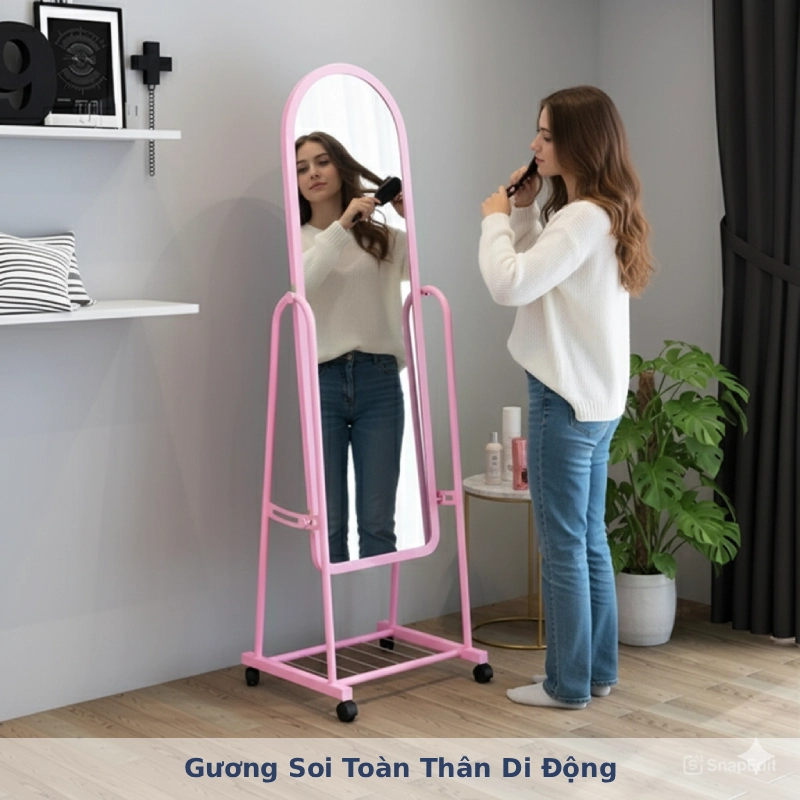 Chân gương tích hợp bánh xe di chuyển linh hoạt, giúp bạn dễ dàng thay đổi vị trí đặt gương mà không tốn sức.
