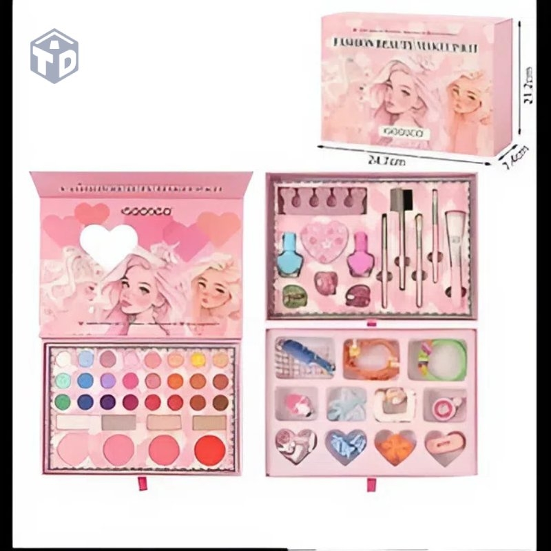 Bộ phụ kiện đa dạng: Bao gồm phấn mắt nhiều màu, má hồng, son môi, cọ trang điểm và phụ kiện tóc xinh xắn, cho bé thỏa sức sáng tạo.