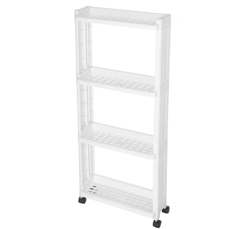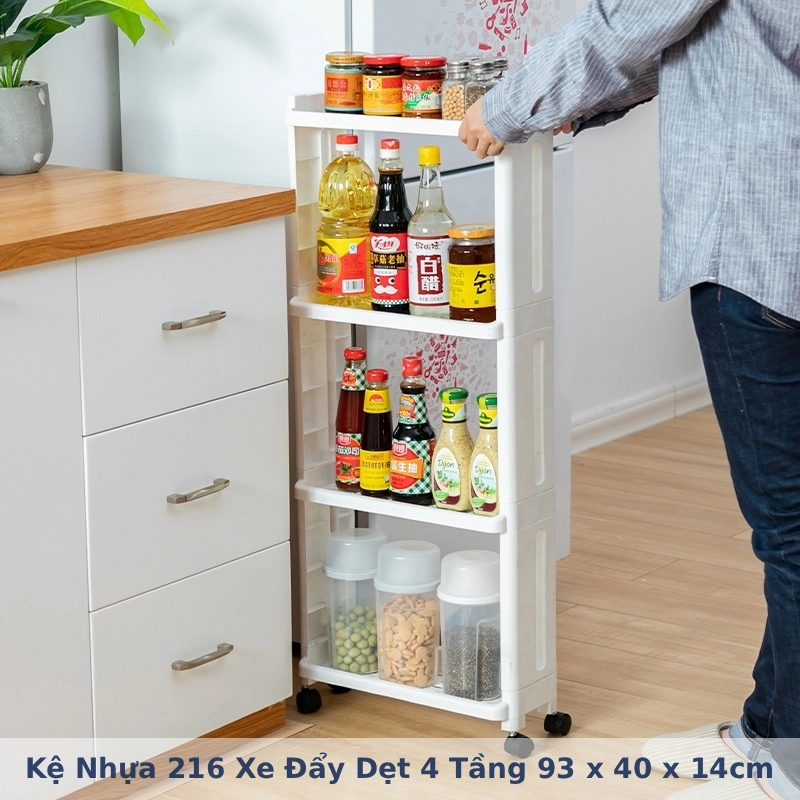 - Kệ đựng đồ đa năng 4 tầng có bánh xe với thiết kế cực kỳ thông minh giúp bạn tận dụng những khe nhỏ nhất trong nhà như giữa 2 khe tủ hoặc bất kỳ góc nhỏ nào để đựng đồ. Sau khi xếp đầy các vật dụng lên kệ bạn chỉ cần đẩy chúng vào khe tường, căn nhà sẽ trở nên gọn gàng, sạch sẽ hơn bao giờ, khi cần lấy đồ chỉ việc kéo nhẹ ra thật tiện ích.