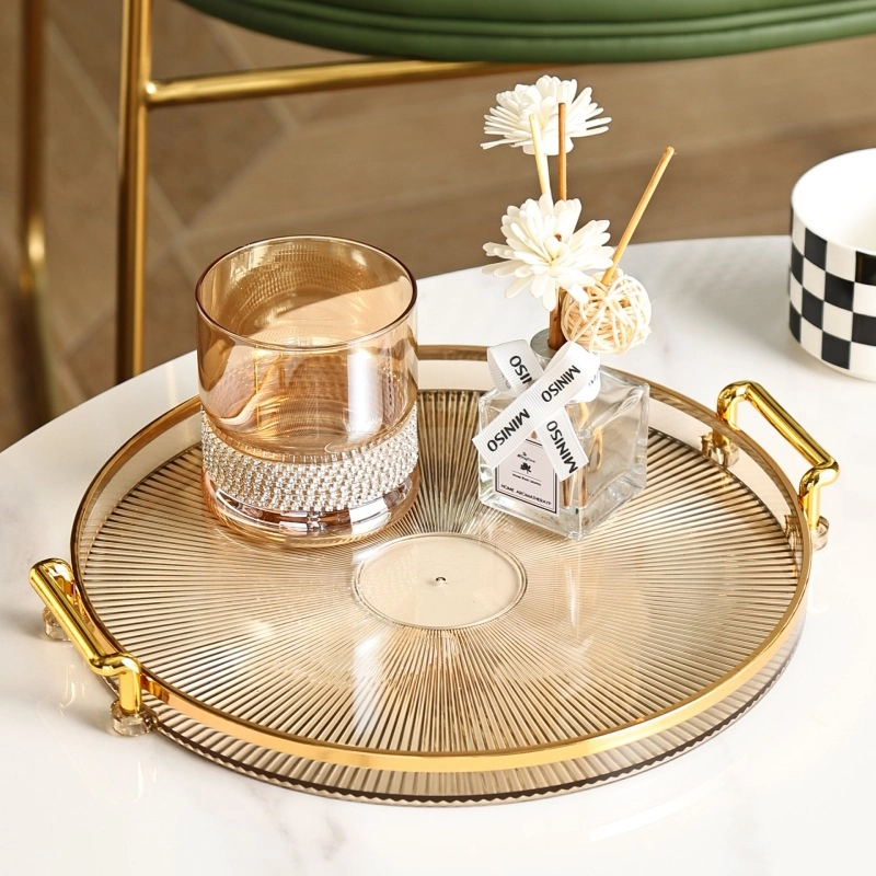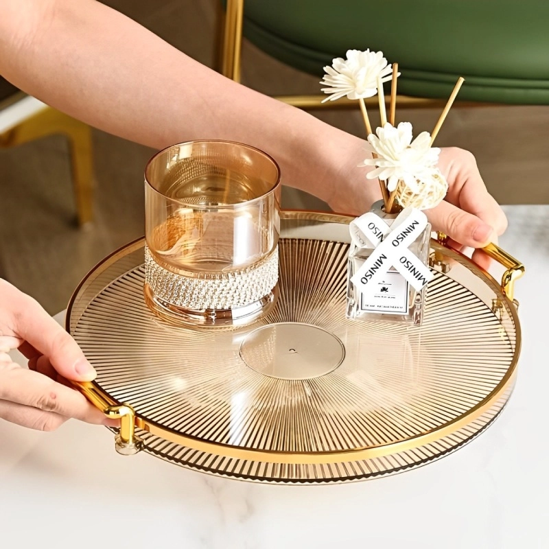 5. Tay cầm bằng vàng kéo dài: Khay trang trí tròn có tay cầm, chắc chắn và bền hơn, khay có tay cầm có đường trơn và tự nhiên, trọng lượng nhẹ, vận hành thuận tiện.