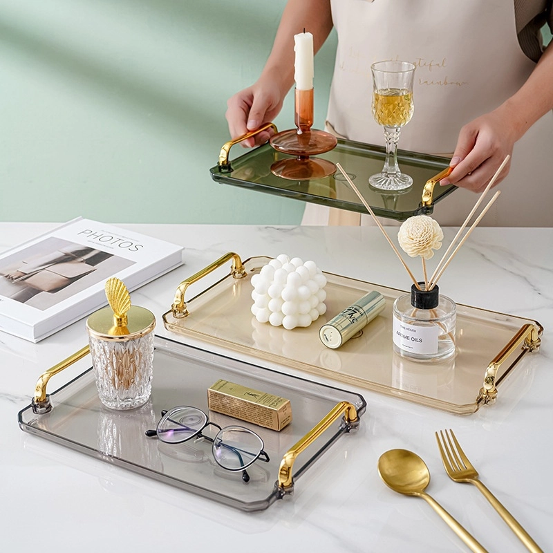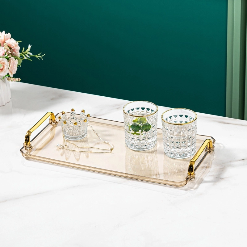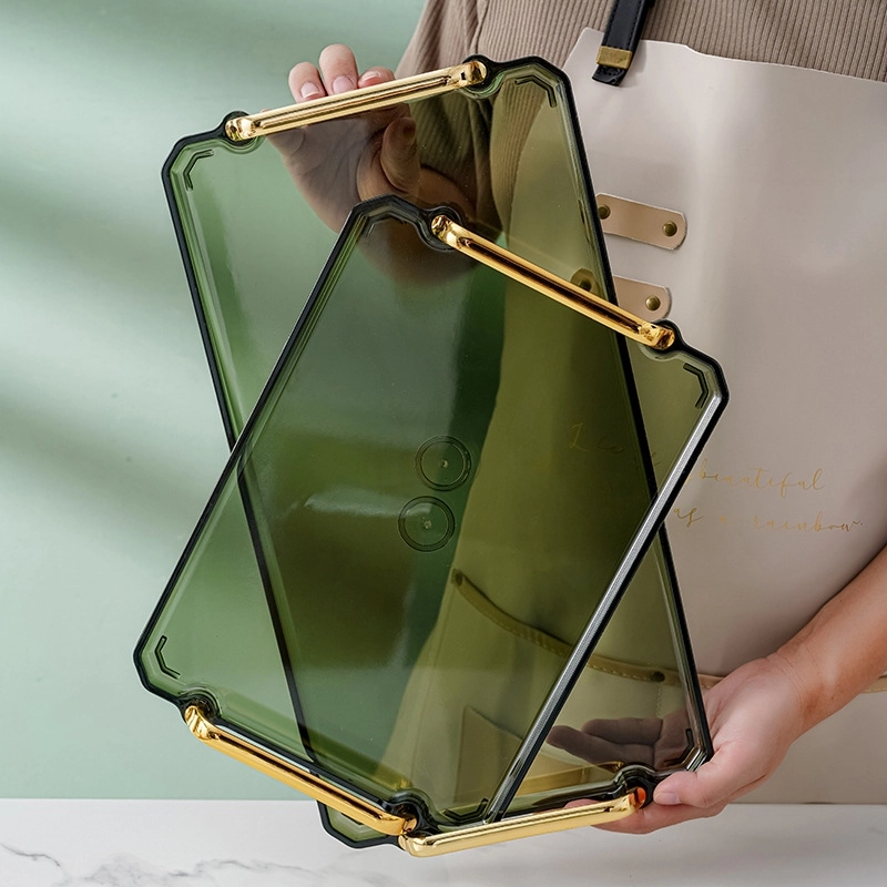 - Khay phục vụ hình chữ nhật có tay cầm có viền và tay cầm bằng vàng để tăng thêm nét sang trọng và tinh tế cho bất kỳ không gian trang trí nào.