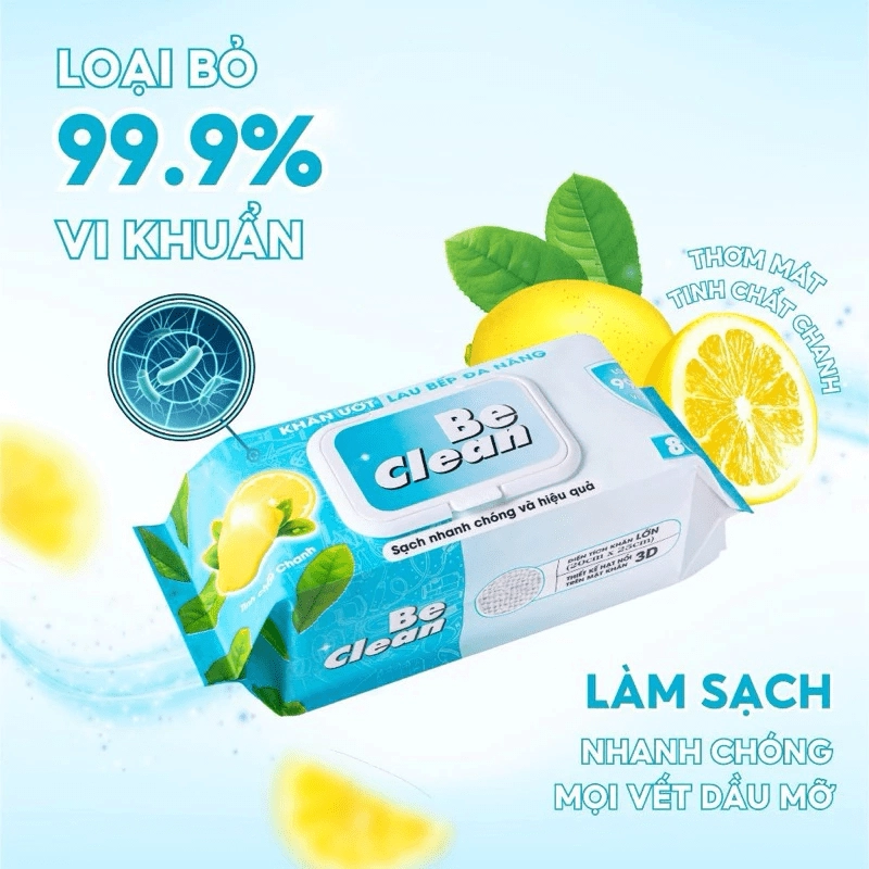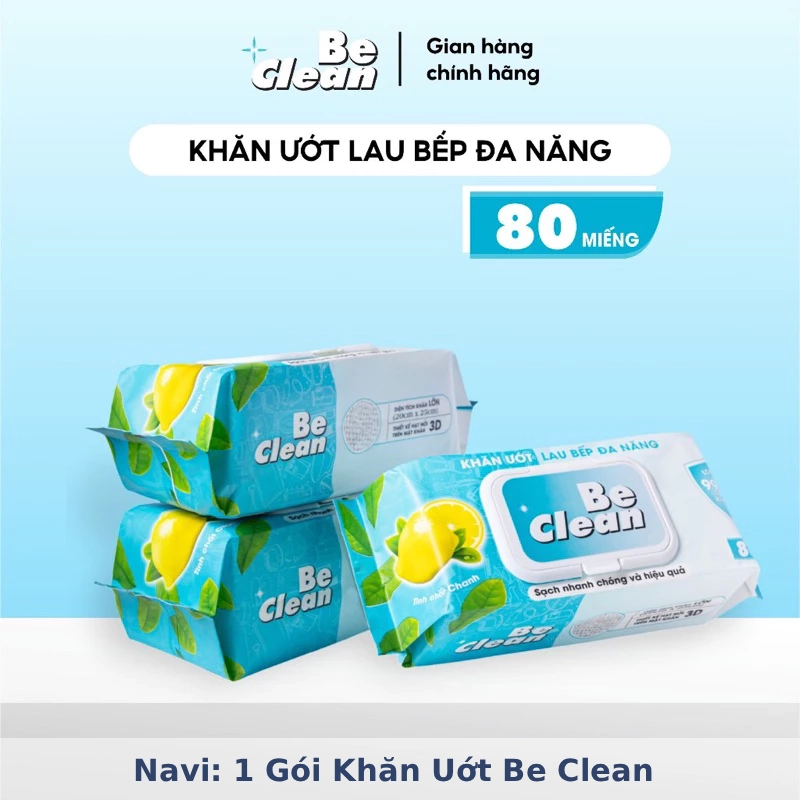 Khăn ướt Navi Be Clean được tẩm dung dịch tẩy rửa nhẹ, giúp lau sạch nhanh dầu mỡ, vết bẩn và cặn thức ăn bám trên bếp, tường gạch, bàn ăn hay lò vi sóng mà không cần rửa lại bằng nước.
