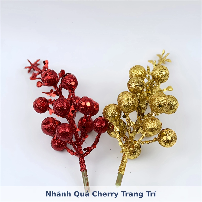 - Thiết kế tinh tế: Cành trái cherry được làm thủ công, phủ kim tuyến lấp lánh, mang đến vẻ đẹp sang trọng và cổ điển.