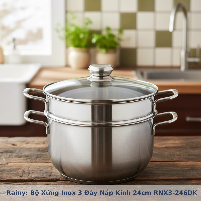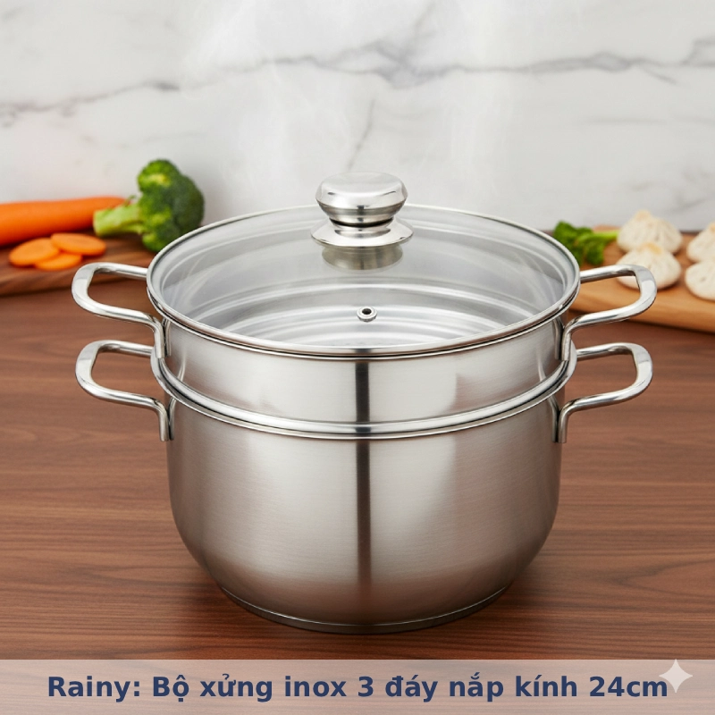 Mang đến trải nghiệm nấu nướng tiện nghi và an toàn cho gia đình bạn với Bộ xửng hấp Inox 3 đáy nắp kính Rainy chính hãng, đường kính 24cm. Đây là trợ thủ đắc lực giúp bạn chế biến các món hấp thơm ngon, giữ trọn dưỡng chất một cách nhanh chóng và dễ dàng.