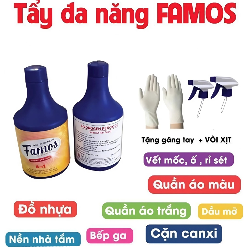 Nước tẩy đa năng Famos 500ML là giải pháp hiệu quả để tẩy sạch mọi vết bẩn cứng đầu, giúp quần áo và đồ dùng luôn sáng trắng và như mới.