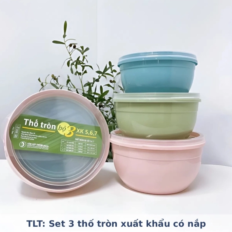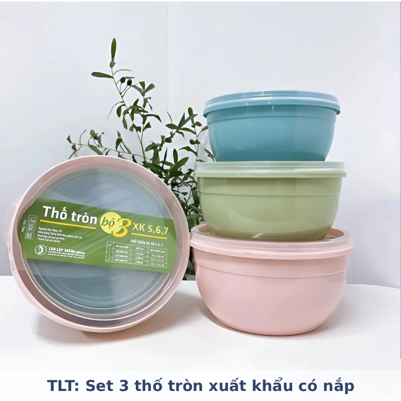 Chất liệu & Thiết kế: Bộ thố được làm từ chất liệu nhựa an toàn, bền đẹp, phù hợp tiêu chuẩn xuất khẩu. Thiết kế dạng thố tròn với thành cao, miệng rộng tiện lợi. Mỗi thố đều đi kèm nắp đậy kín bằng nhựa trong suốt, giúp bảo quản thực phẩm sạch sẽ và tránh lẫn mùi.