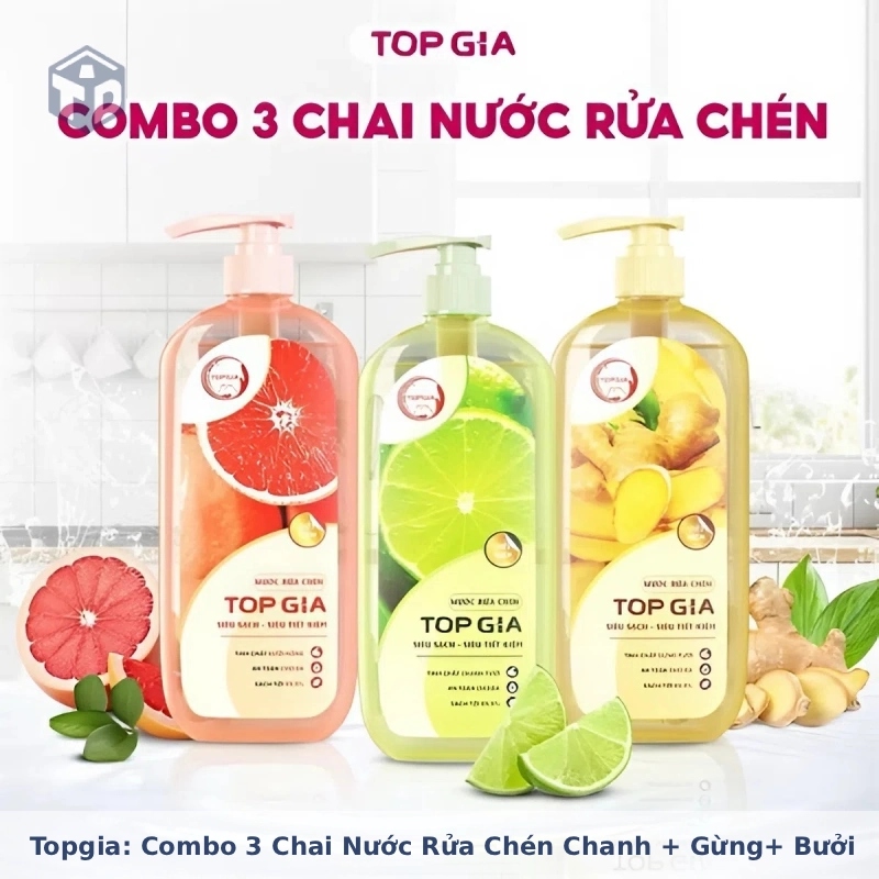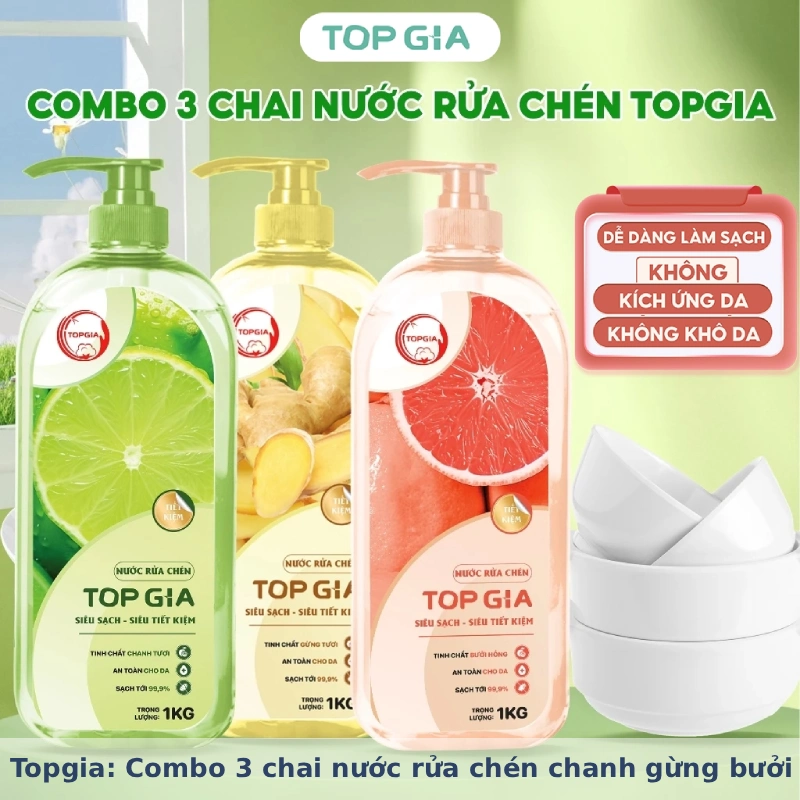 Nước rửa chén Top Gia là sản phẩm tẩy rửa bát đĩa có các thành phần tự nhiên, dịu nhẹ cho da tay, với combo ba chai mang ba hương khác nhau: bưởi, chanh và gừng.