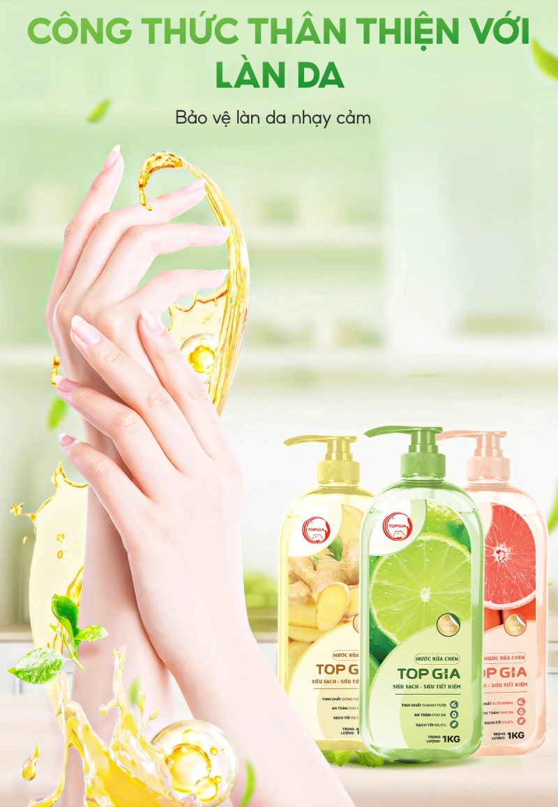 - Đặc điểm: Nước rửa chén Top Gia được giúp làm sạch dầu mỡ hiệu quả, đồng thời bảo vệ da tay với thành phần dưỡng ẩm như Glycerol.